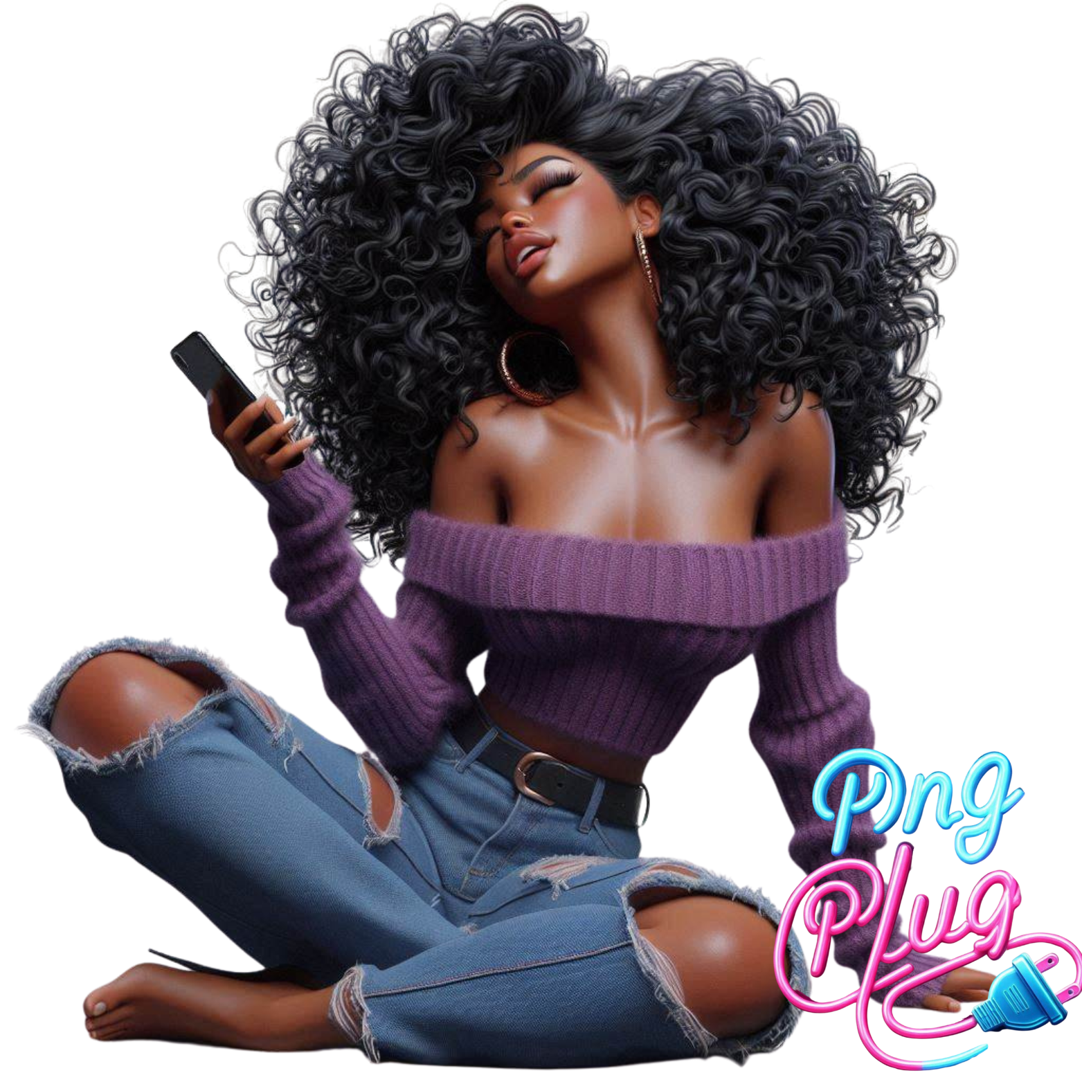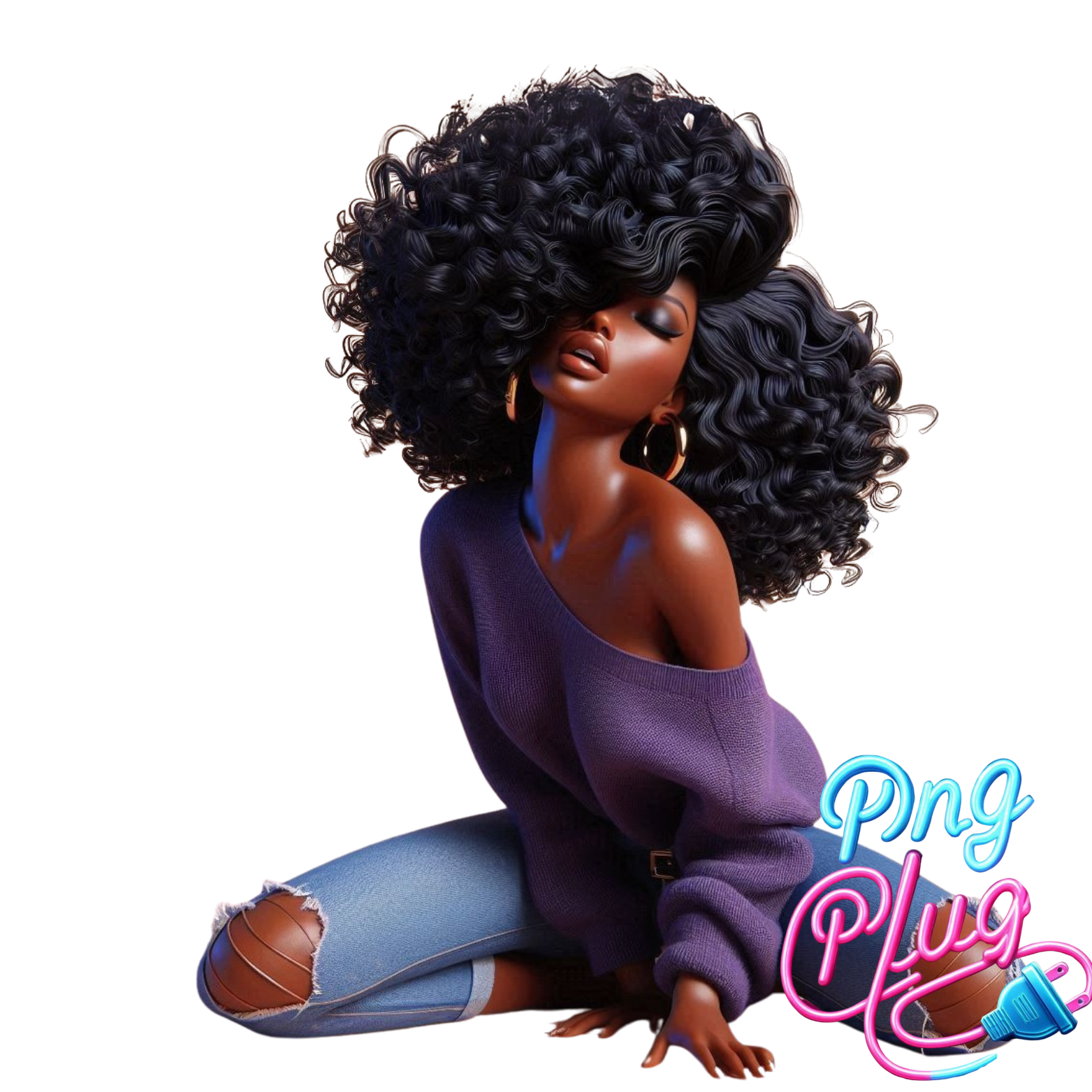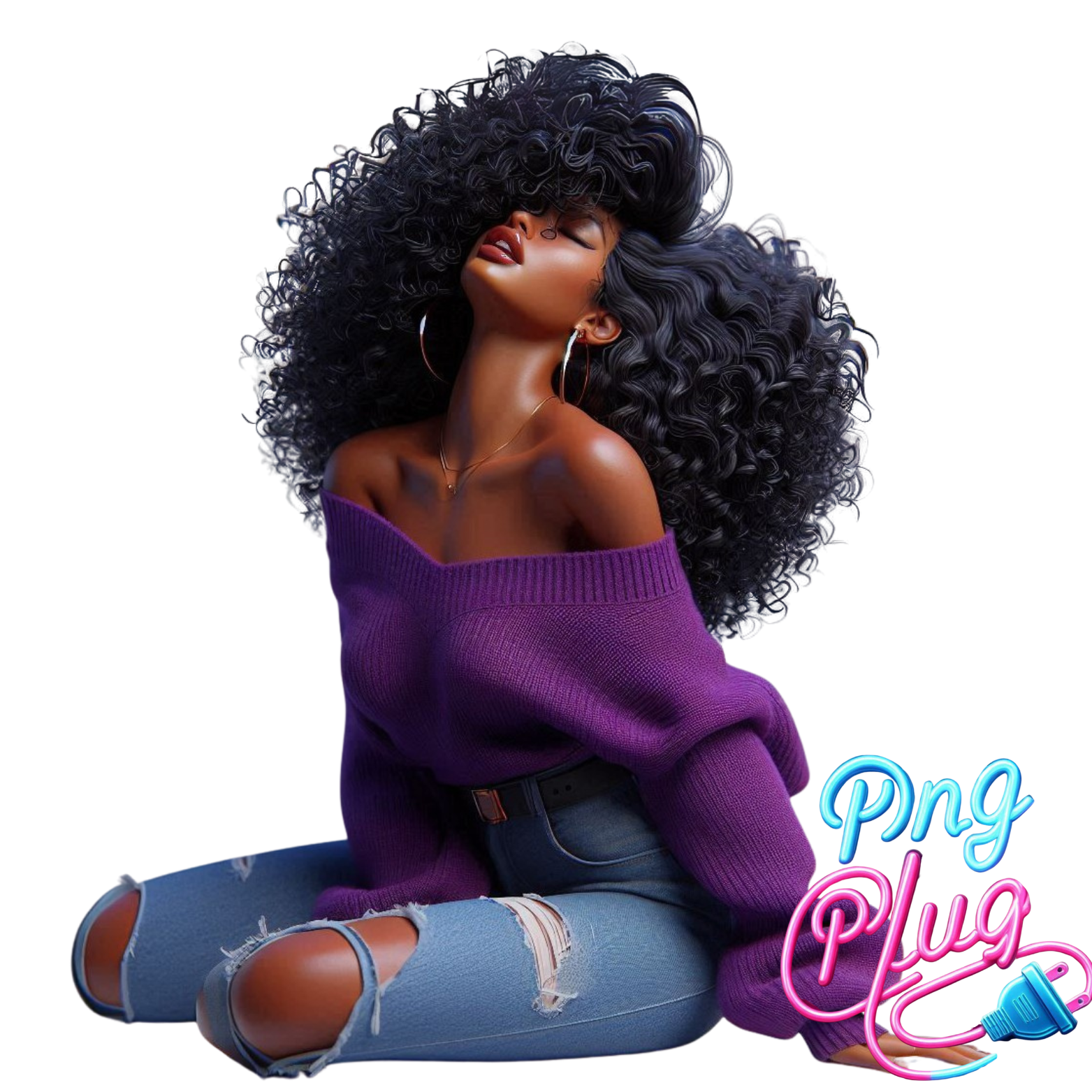 Curly Hair Black Girl PNG – Purple Off-Shoulder Sweater, Ripped Jeans, Relaxed Vibe - Instant Digital Download