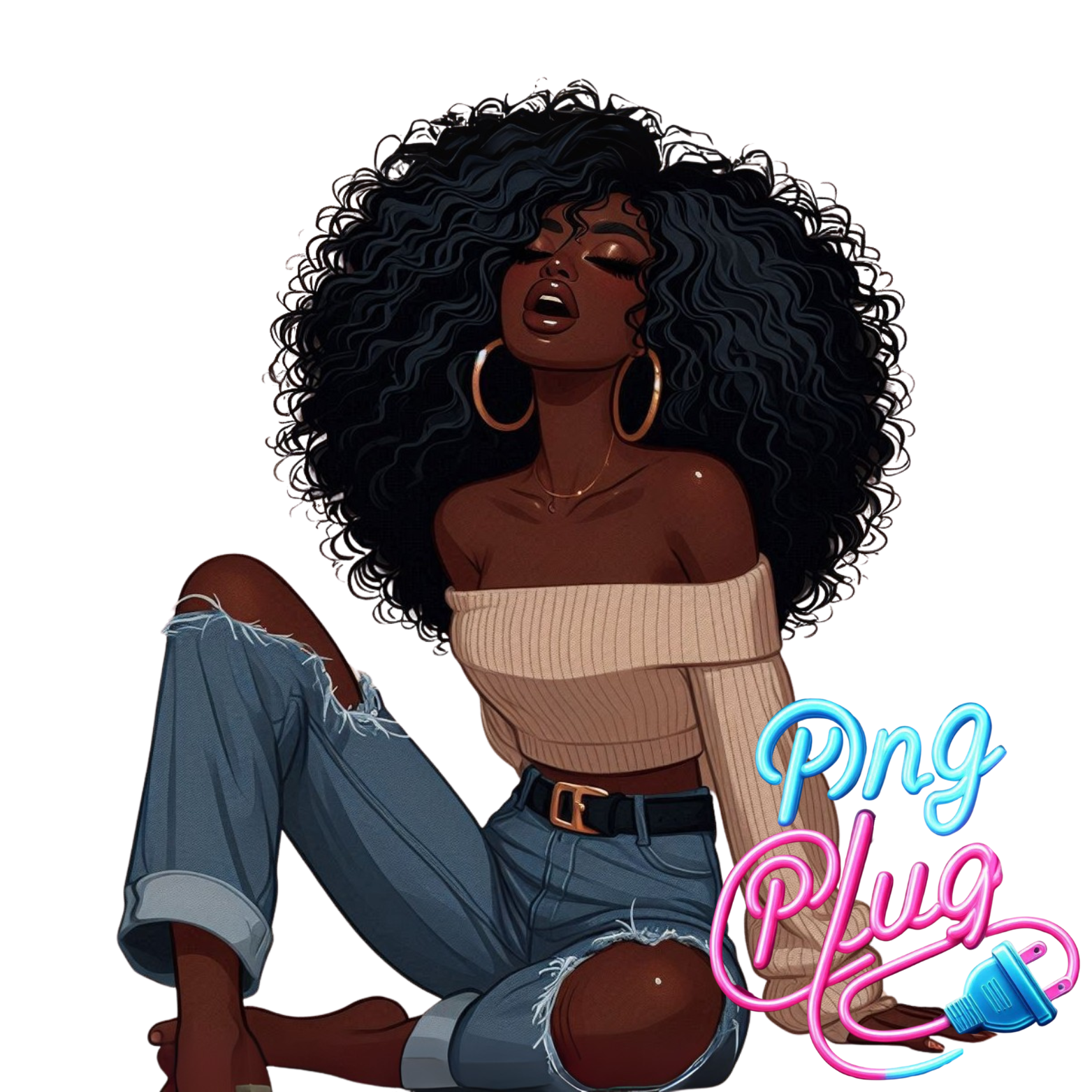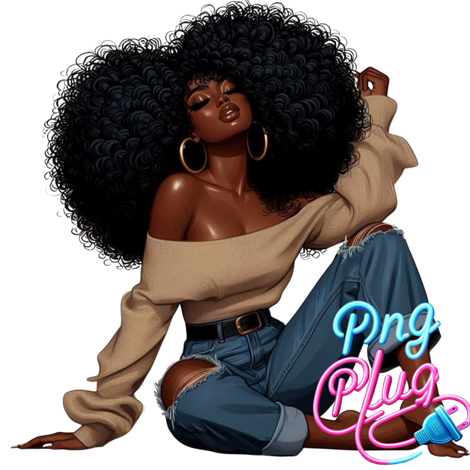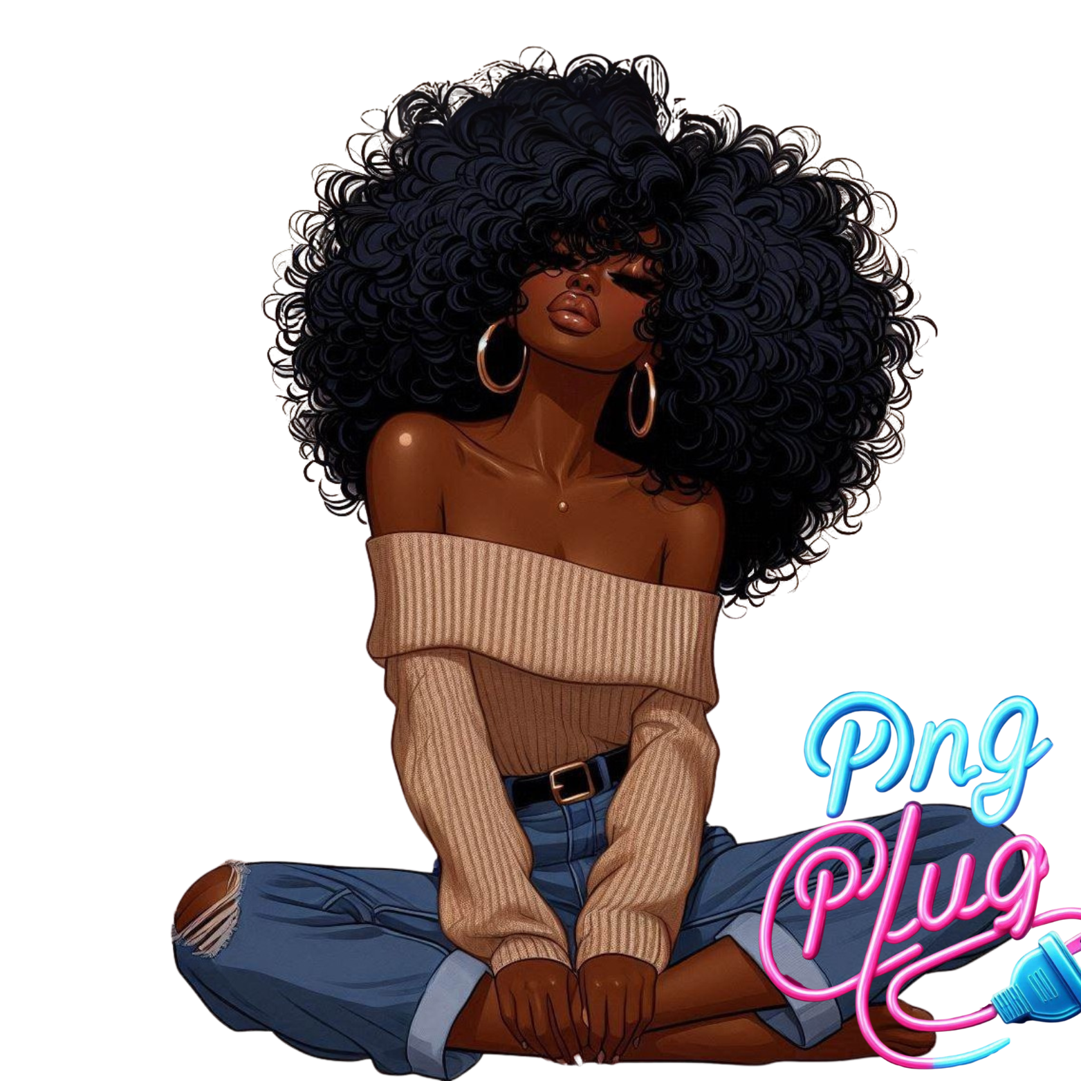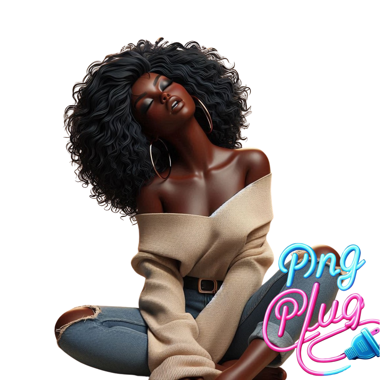 Curly Hair Relaxed Woman PNG | African-American Clipart | Off-Shoulder Sweater Sitting Pose - Instant Digital Download