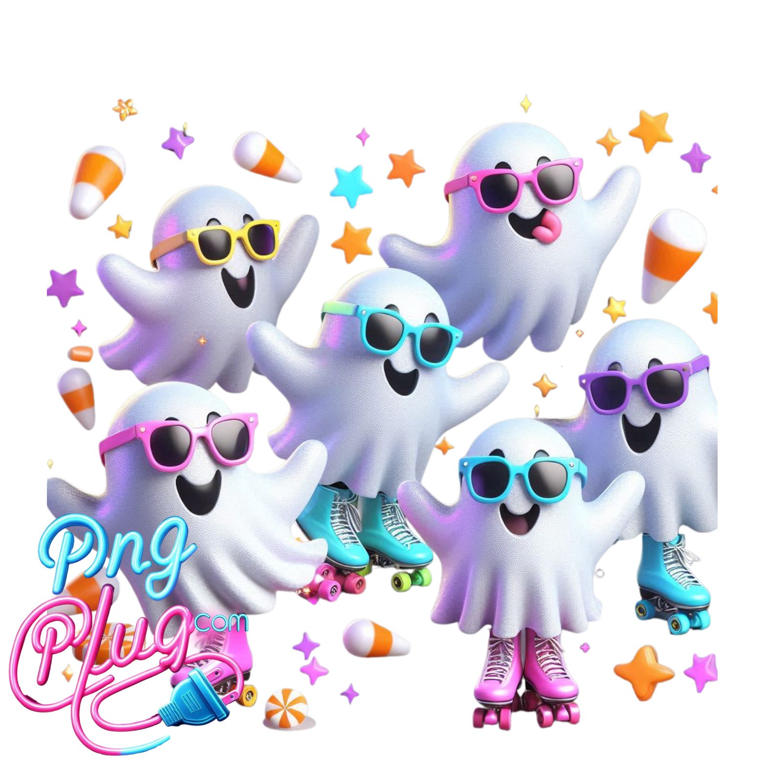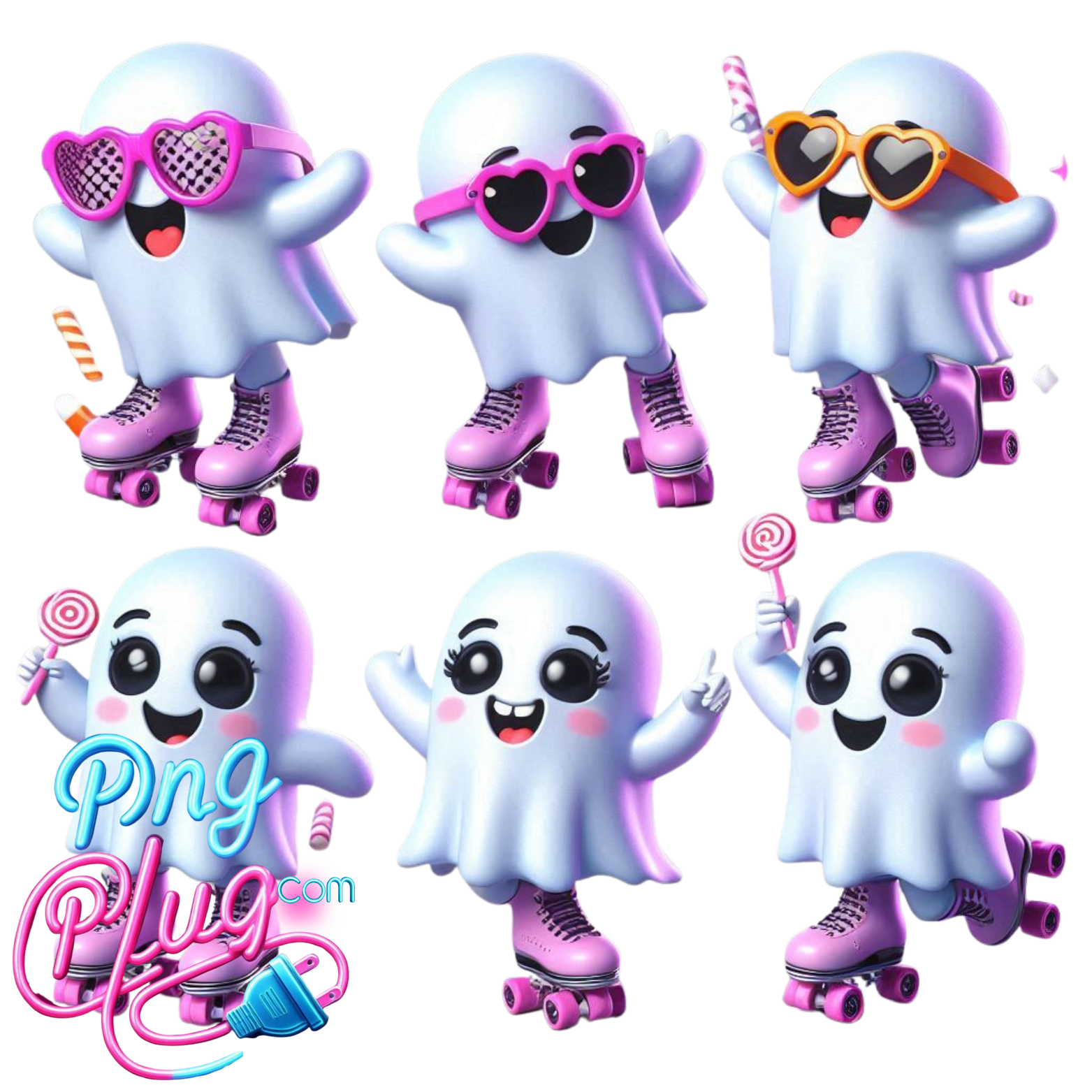 Cute Roller Skating Cartoon Ghosts PNG – Colorful, Fun, Kawaii Digital Art for Stickers, Crafts- Instant Digital Download