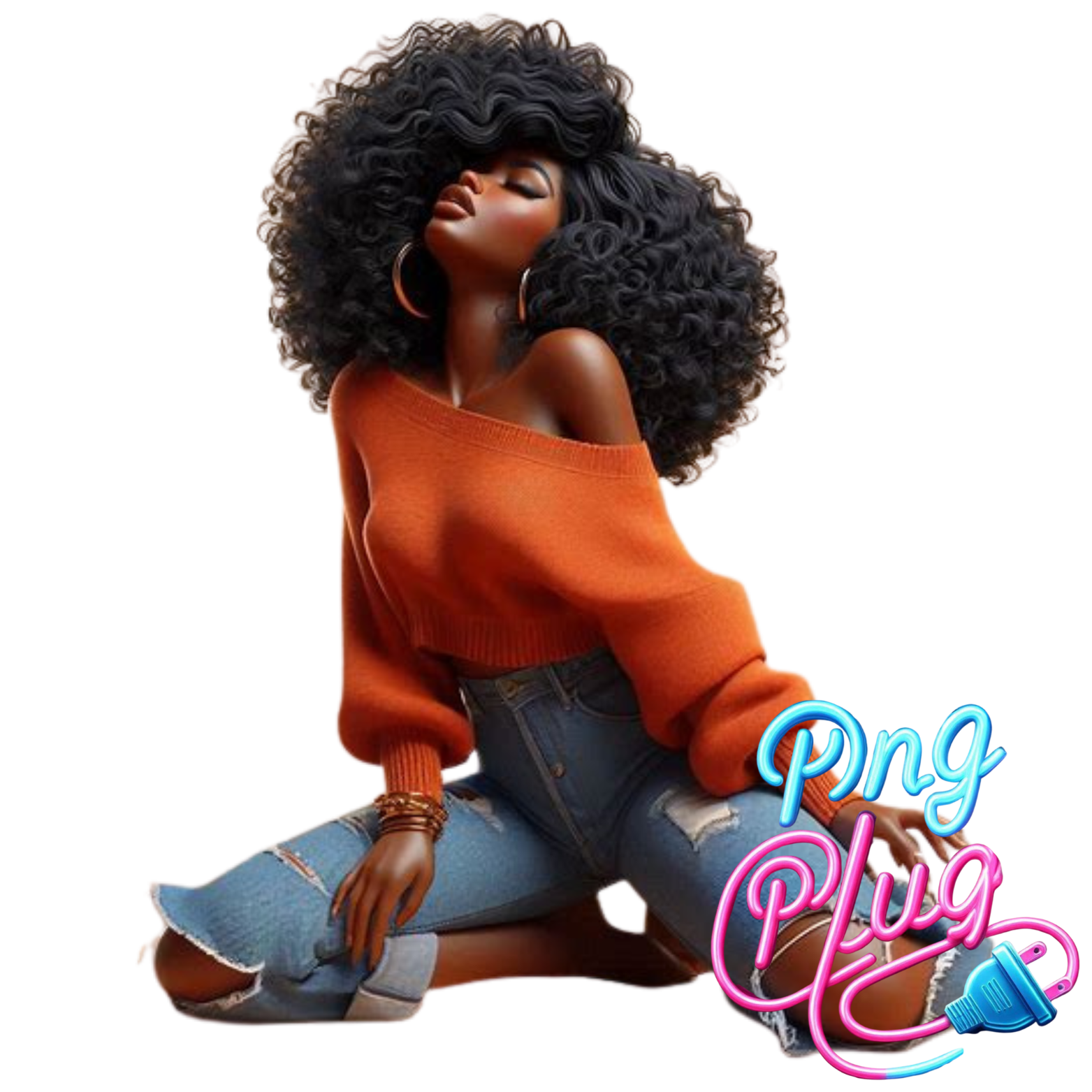 Relaxed Black Woman Sitting Cross-Legged PNG | Calm Vibes, Curly Hair, Cozy Sweater | Peaceful Digital Art for Sublimation- Instant Digital Download